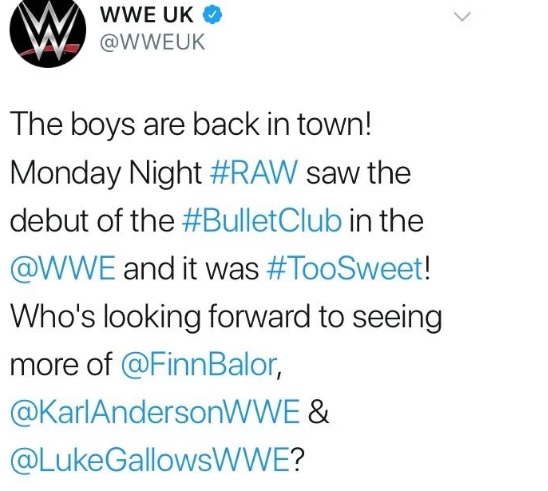 حسنا ، حساب WWE UK على تويتر يجب أن يتم تحديثه بشأن سياسة الشركة فى هذه المرحلة لأن مايكل كول قد أشار الى The Bullet Club على أنه ” The Club الشهير ” عندما كان يشير الى الفريق خلال مواجهة أي جاي ستايلز و فين بالور الملحمية فى TLC .