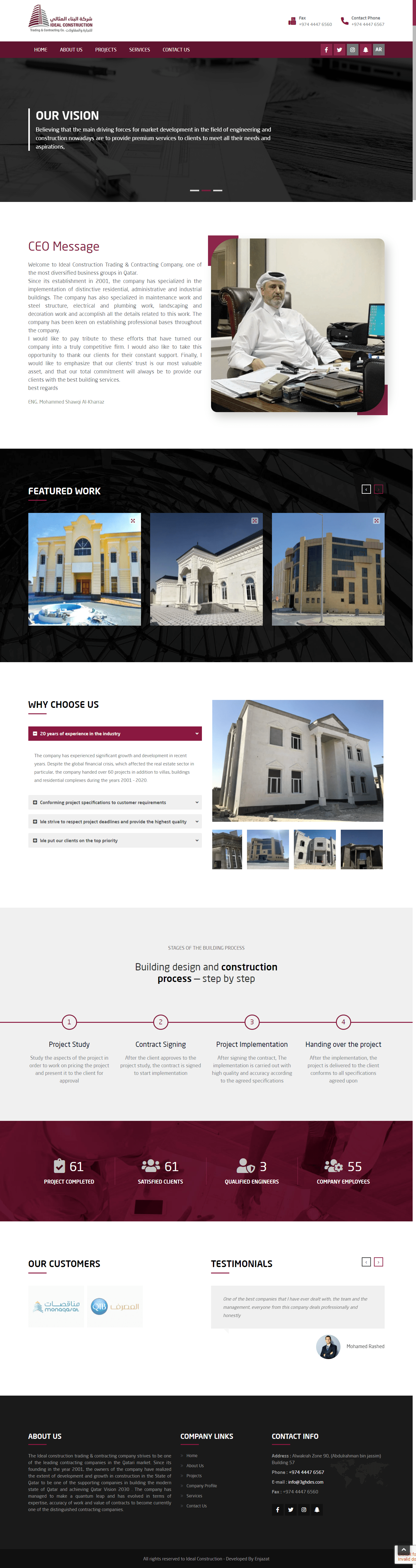 شركة Ideal Construction هي شركة متخصصة فى العقارات و المقاولات بدولة قطر , تم عمل التصميم خصيصاً لشركة Enjazat بدولة قطر, تم الاعتماد على وردبريس, موقع متعدد اللغات والمميزات